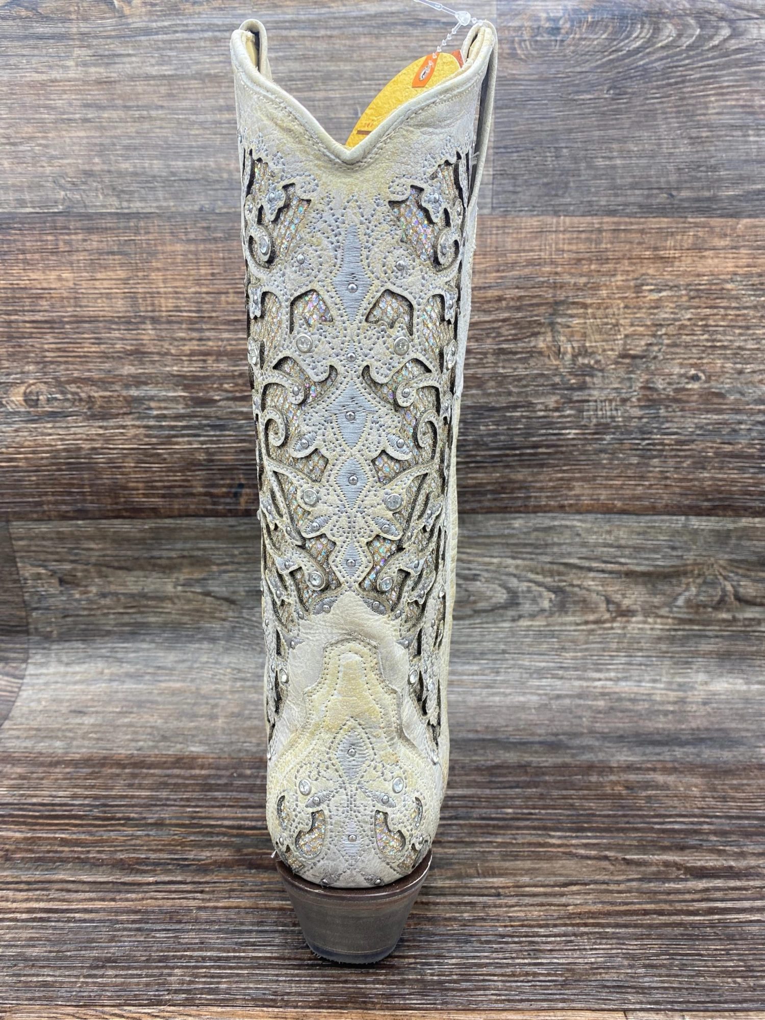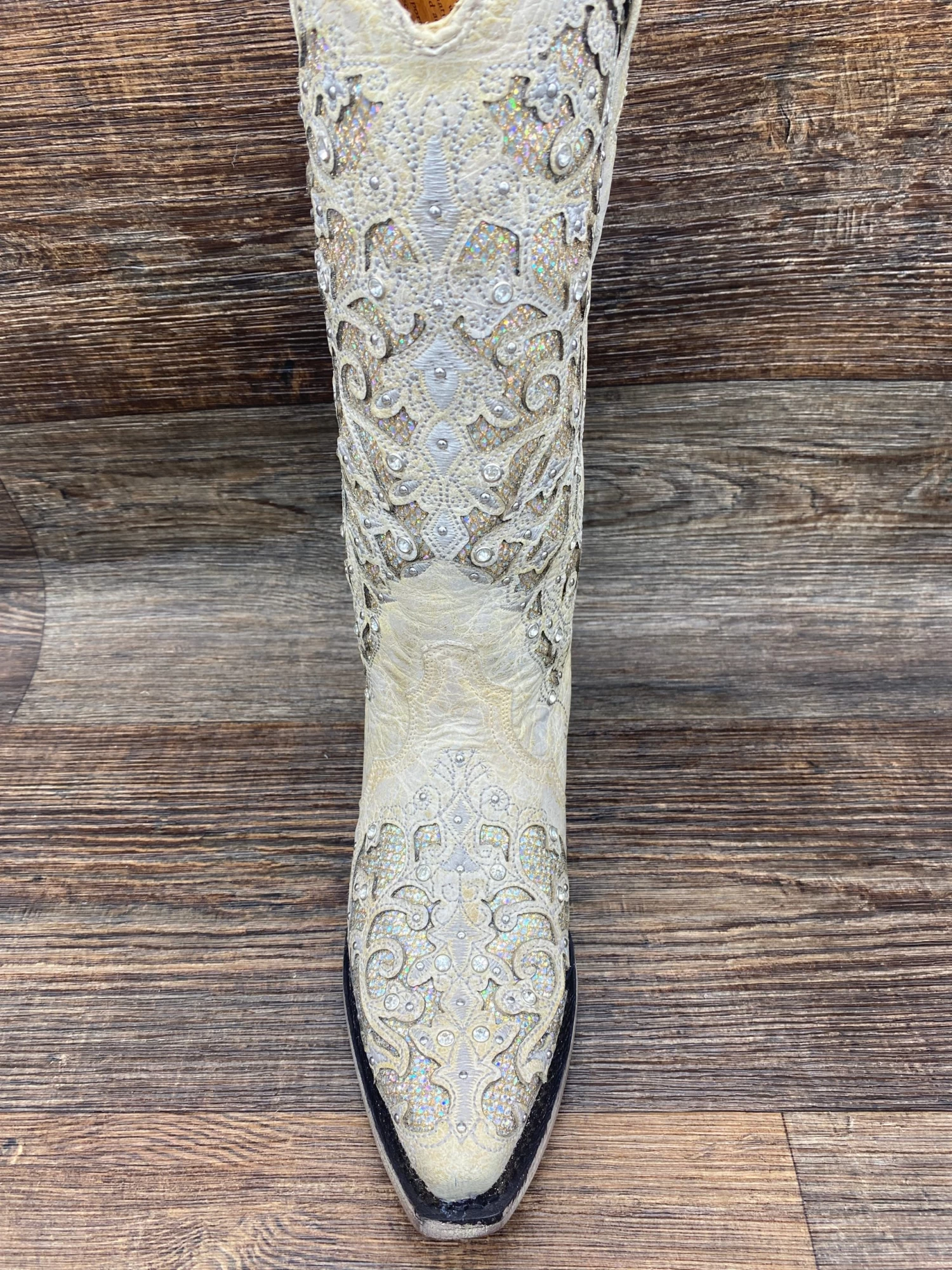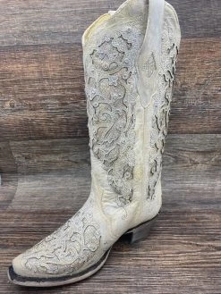 White Glitter Inlay and Crystals – Made with an original cowhide leather overlaying an iridescent glitter. This boot is finished with crystal accents making it perfect for your big day or any special event where you want to shine.