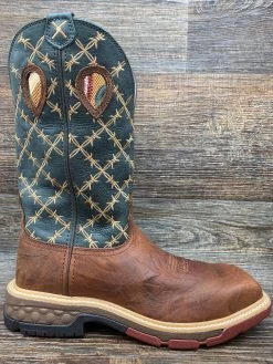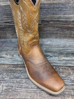 This style is complete with a ¾ genuine Goodyear® welt construction, genuine leather welt with double row cotton stitch and a high-abrasion resistant rubber heel lift. It is finished off with a leather stacked heel base, 1 ½” stockman with rocker heel and square toe,