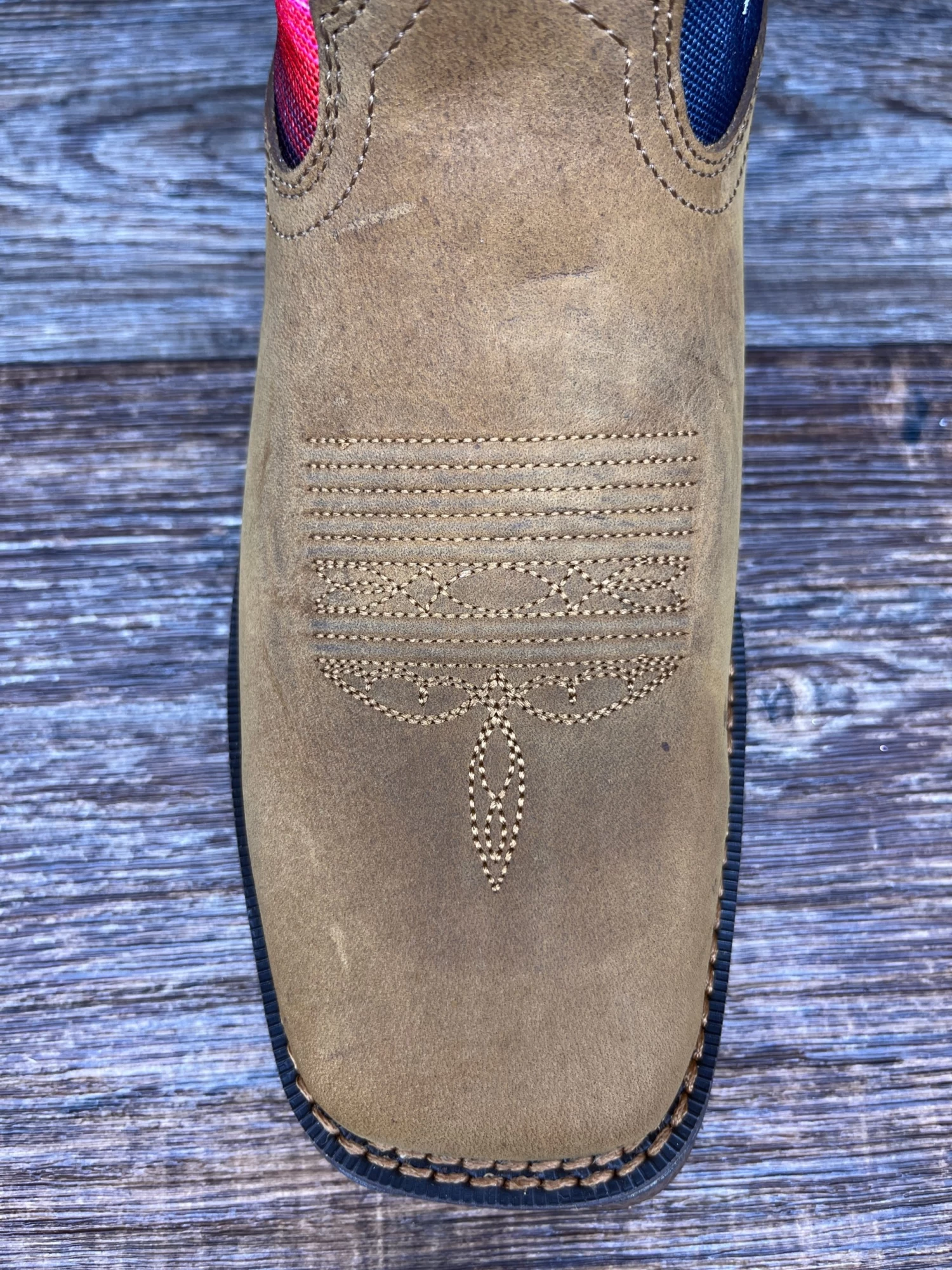 This Lady Rebel⢠by Durango® Western Boot will be the most attention-grabbing item in your closet. The stunning upper has American Stars with Serape Stripes on the shaft, full-grain brown leather that looks fashionably distressed, toe bug stitching and pull tabs that make it possible to get this pull-on boot on/off effortlessly.