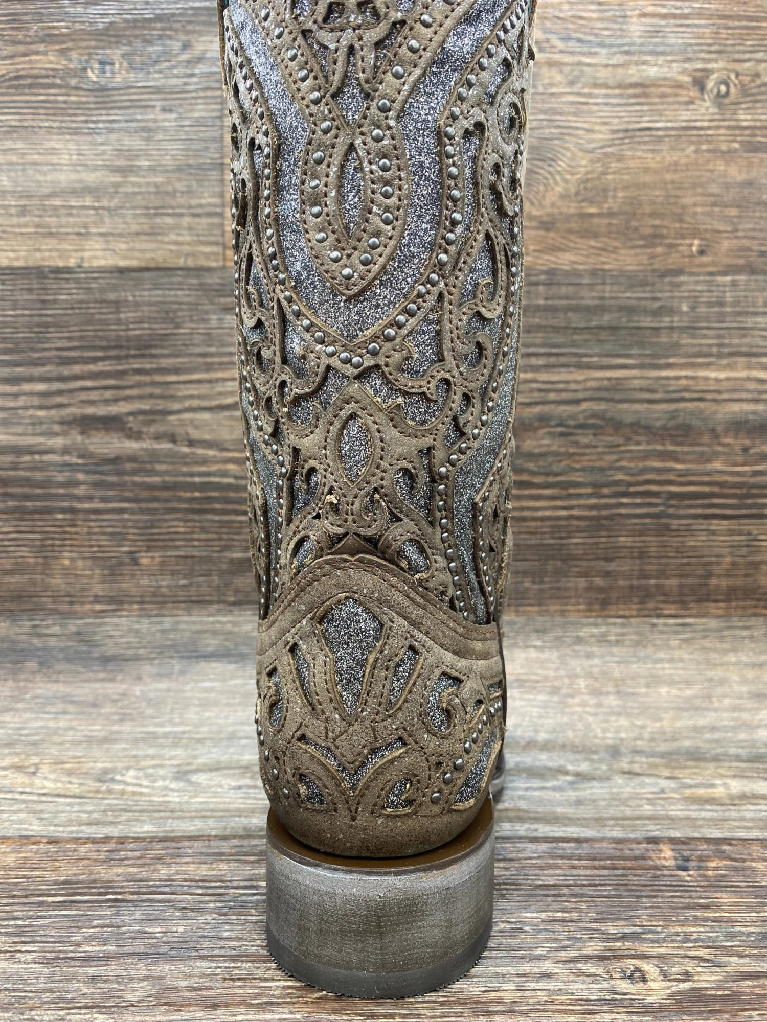 Ladies Brown/Grey Inlay Embroidery & Studs Sq. Toe – A smooth grey glitter is featured by a cedar brown laser cut overlay design. This boot adds class and touch of glam to any outfit it is paired with.