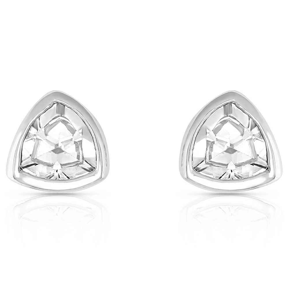 6.5mm trillion shaped cubic zirconia stones set in a bright silver finish on hypoallergenic stainless steel posts.