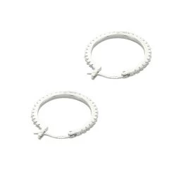 A medium silver toned set of hoop earrings lined with clear stones with a latch back.