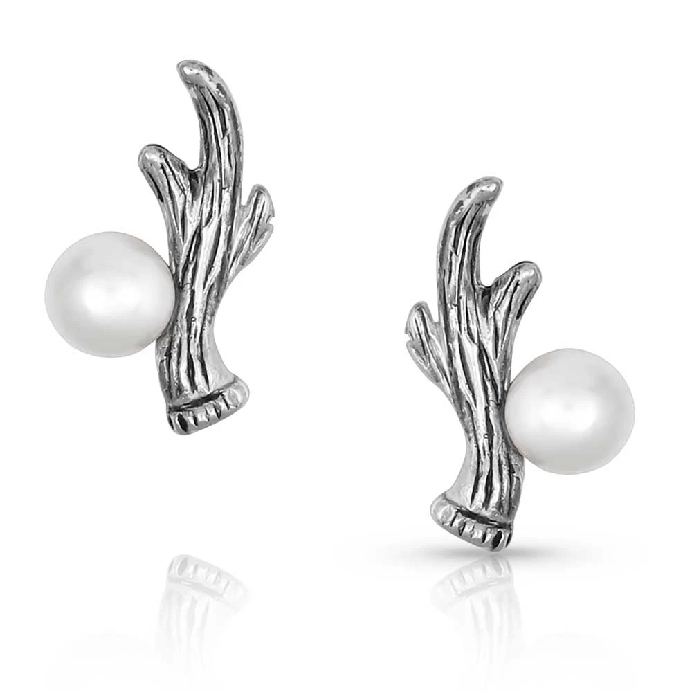 From the Pursue the Wild Collection by Kristy Titus, these are sterling silver-finished earrings with antlers and a white pearl. They secure from hypoallergenic post-back wire.