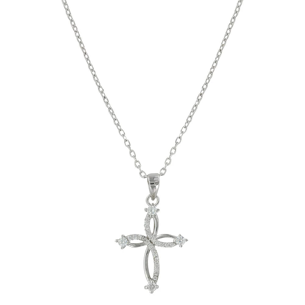 A silver toned necklace with in a cross shape with swooping lines of tiny clear stones and one large one at the end of each arm. Necklace sits on a 19 inch chain.