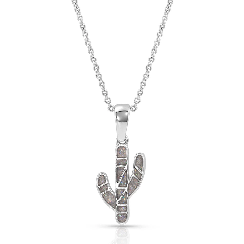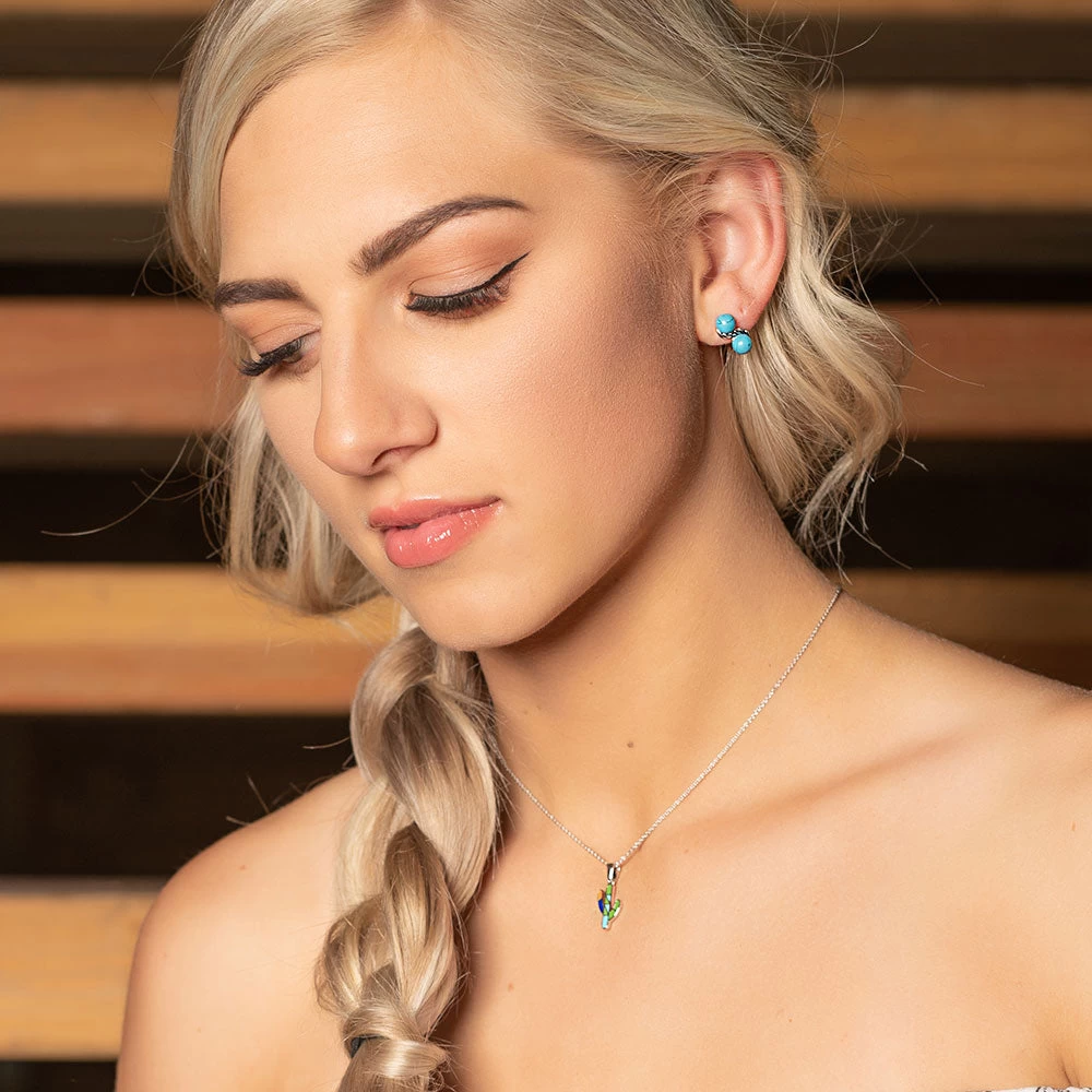 Minimal and fun with an unexpected double side, our cactus necklace has one side of blue, green, and reddish orange lacquer paint, with a reverse side of white opal stones framed by bright silver-tones hangs from a simple chain and is the perfect jewelry item to slip on for a girl’s day. This necklace is flirty and fun and can make anyone feel like only good things are coming your way. Cactus pendant hangs on a simple silver-toned bail on a princess length, 19 inch chain.