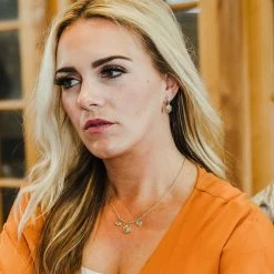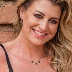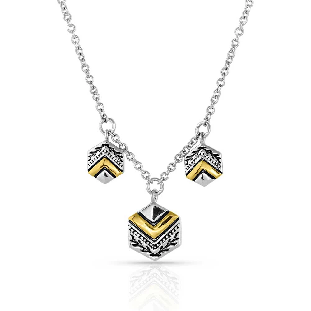 Silver-toned necklace holding three hexagon-shaped charms that are linked together in the center. The charms hold geometric lines and gold-toned etchings.