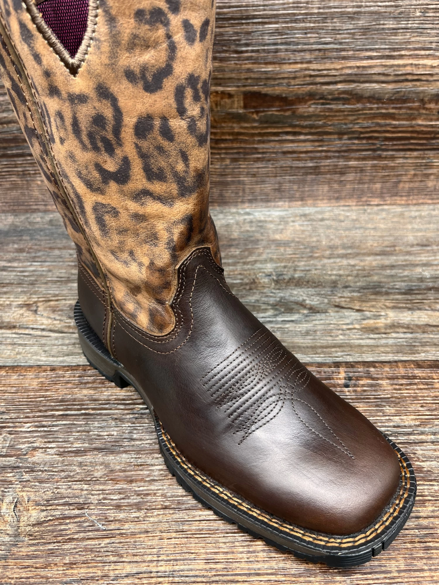 Introducing our first women’s exclusive western collection, the Rocky Rosemary Women’s Western Boot is designed to offer all-day comfort, safety, and stability. With a mix of fashion and functionality, this 12-inch brown and leopard full grain leather boot is packed with features built to withstand the job. A light and flexible construction, fiberglass shank, oil- & slip-resisting rubber outsole with EVA midsole, and an EnergyBed footbed all work together to keep you on your feet for longer. Add in an expansion fit seam for easy on and off after those long workdays. This square toe pull-on boot meets ASTM F2892 electrical hazard standard for soft toe work footwear.